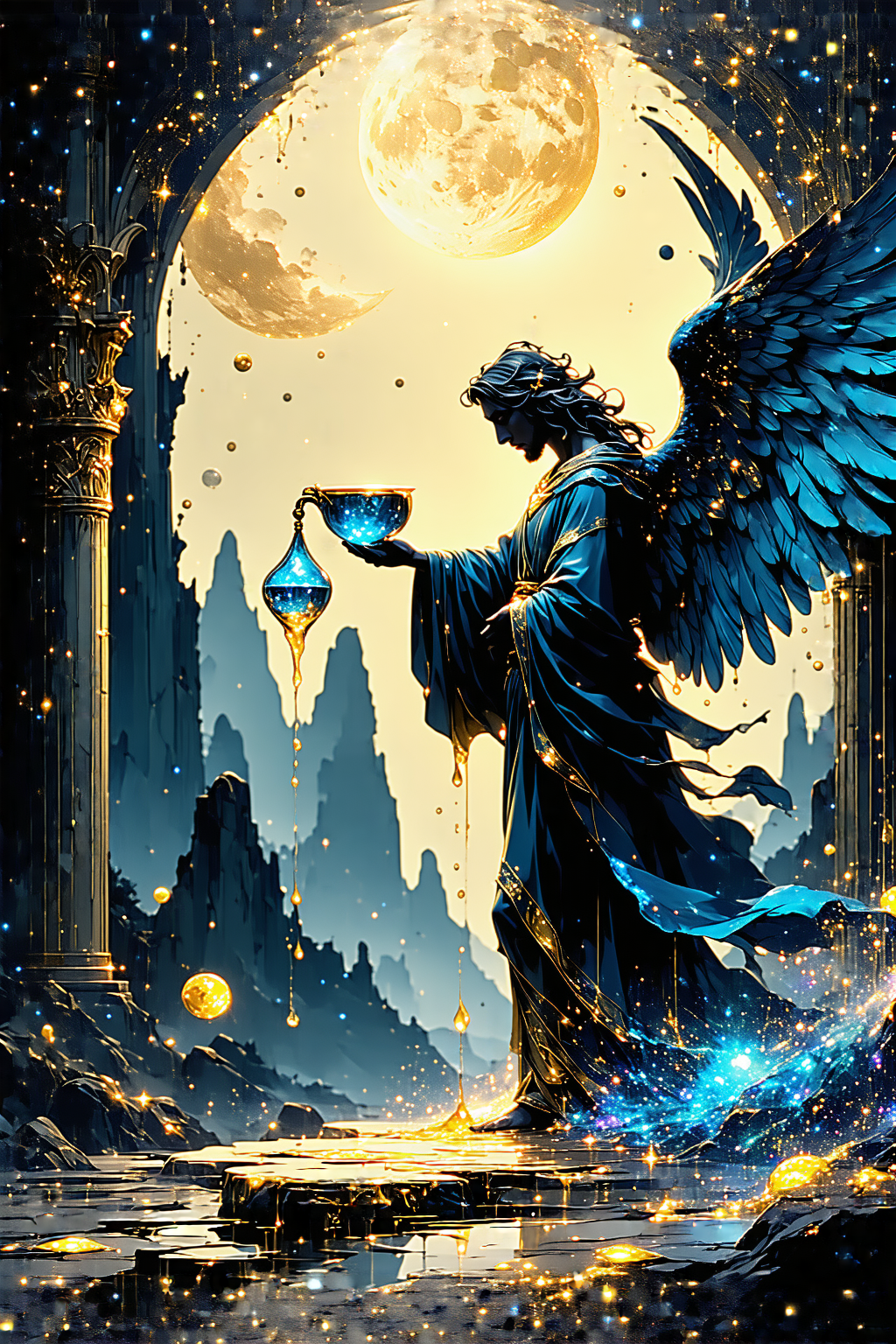 The card features a winged angel (often gender-neutral) standing with one foot on rocks (the material world) and one foot in the water (the subconscious). They pour liquid between two cups, defying gravity, symbolizing the magical act of finding the "middle path" where miracles happen. In the background, a path leads up to a mountain with a glowing crown (or sun), representing the higher purpose that comes from inner peace. The triangle on the angel’s robe represents spirit contained within the square of matter. Consider how the idea of "mixing" applies to your life—what two things are you trying to combine right now?